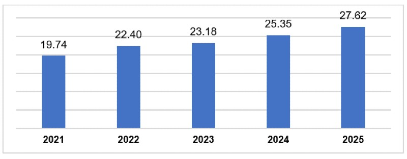 Vốn đầu tư nước ngoài giải ngân trong 5 năm qua, trong đó, năm 2025 đạt đỉnh với 27,62 tỷ USD
